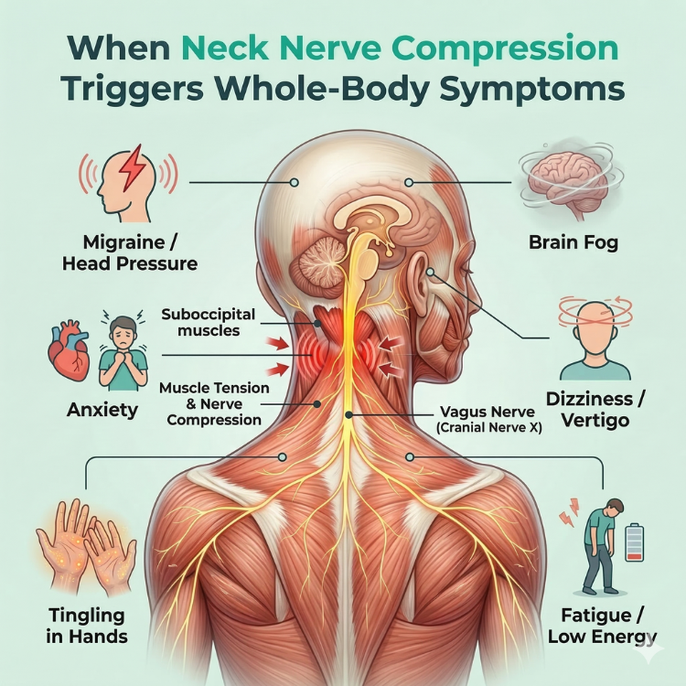 Tight muscles around the cervical spine can create pressure that contributes to headaches, dizziness, and neck discomfort.