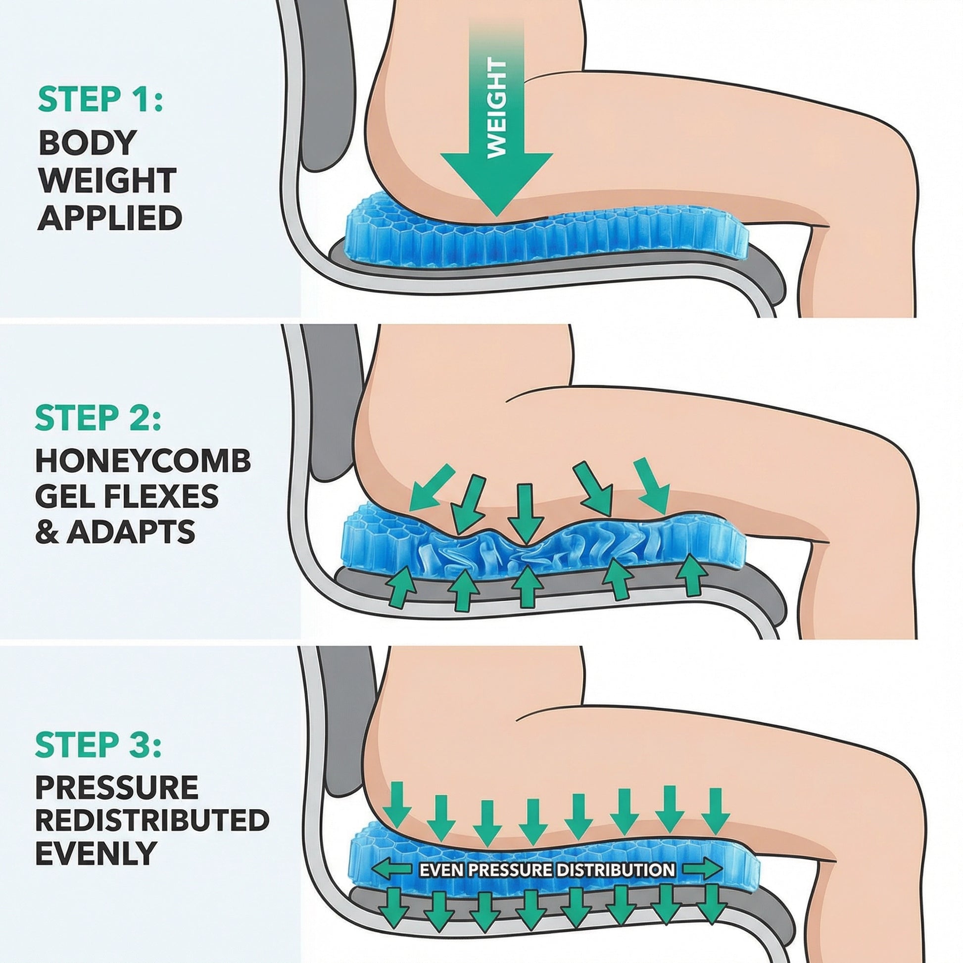 Each cell adapts to your body, reducing strain on your lower back, hips, and tailbone—while maintaining proper spinal alignment.